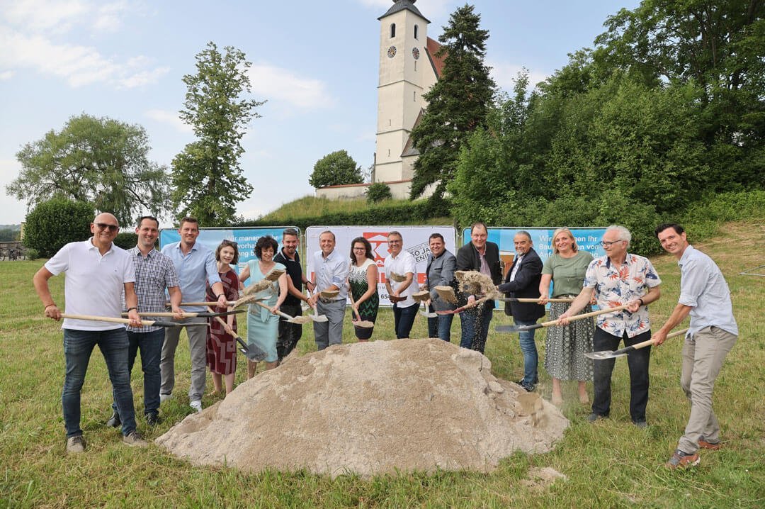 Spatenstich fürs neue Gemeindeamt in Rüstorf inklusive zweier Krabbelstubengruppen und einer Kindergartengruppe – unter anderem mit Michael Rosenauer (7. von links), Bereichsleiter eww Gebäudelösungen. Foto: © Helmut Klein